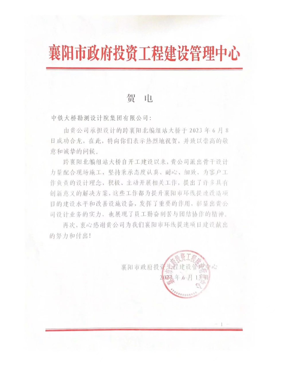 6月13日,收到襄陽市政府投資工程建設管理中心發來的賀電,跨襄陽北編組站大橋自開工建設以來,襄陽市環線提速改造項目組派出骨干設計力量配合現場施工,堅持秉承態度認真、耐心、細致、為客戶工作負責的設計理念,積極、主動開展相關工作,提出了許多具有創新意義的解決方案,這些工作都為提升襄陽市環線提速改造項目的建設水平和改善設施設備,發揮了重要的作用,彰顯出中鐵大橋院集團設計業務的實力,也展現了員工勤奮刻苦與團結協作的精神。